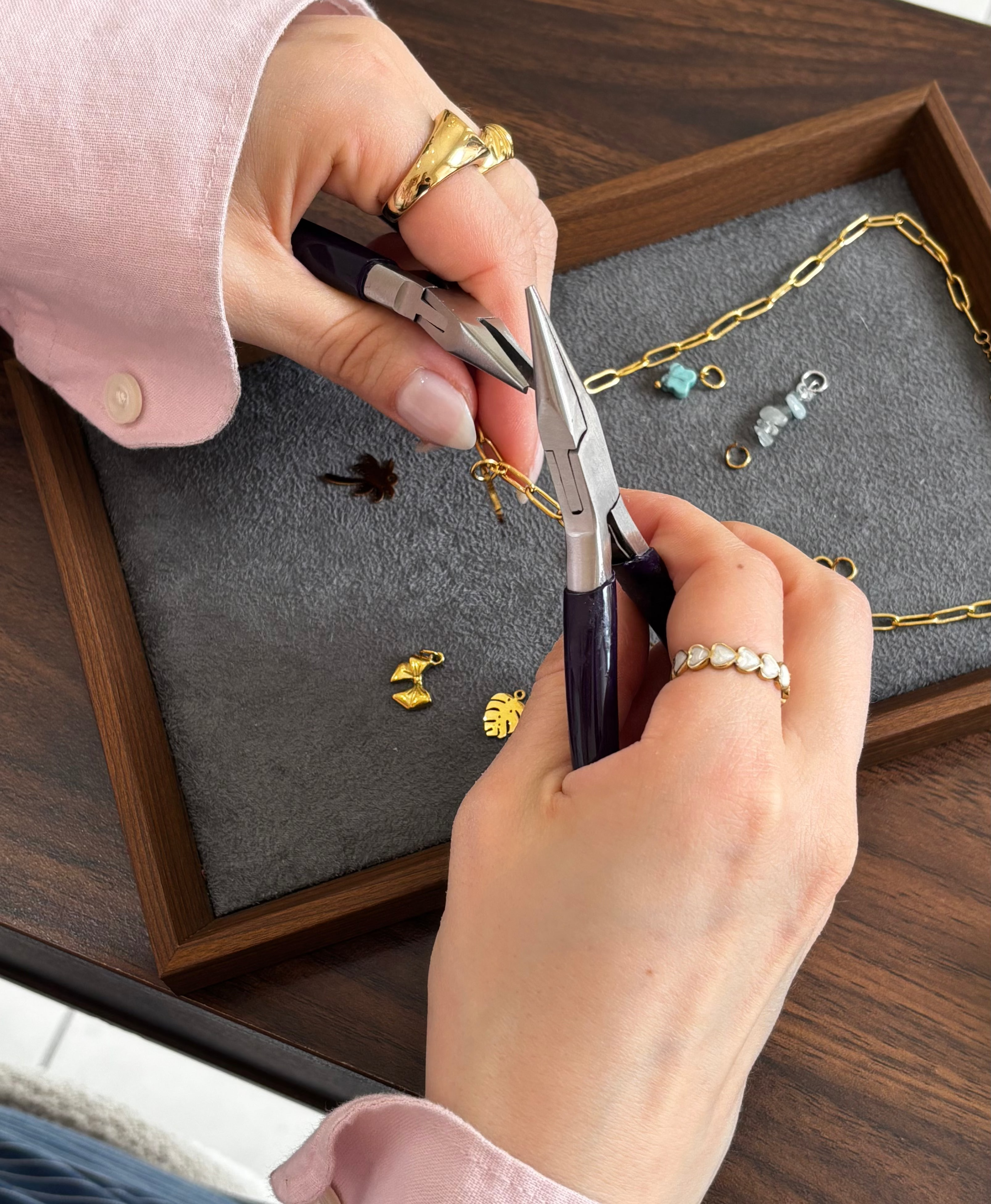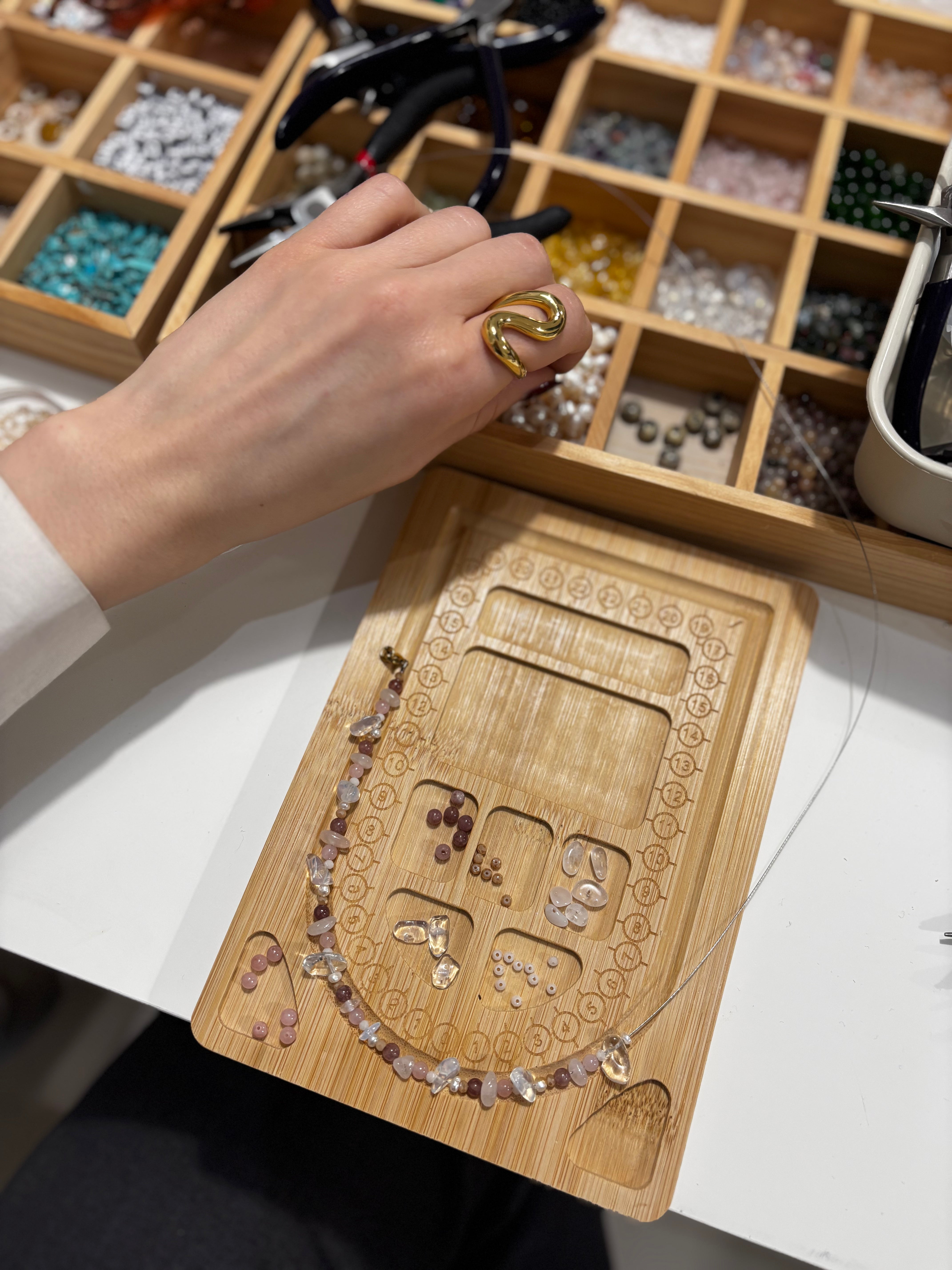 In dem Workshop erlernt ihr Basics der Schmuckherstellung, Verschluss Techniken und viele weitere Tips und Tricks. Am Ende des Workshops nehmt ihr euer selbst designtes Schmuckstück mit nach Hause!